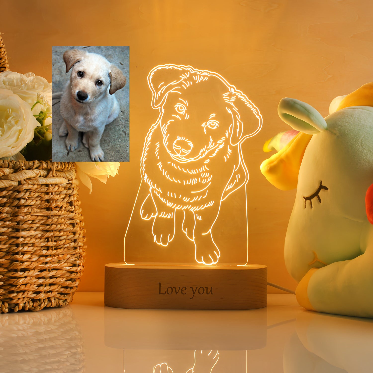 Personalize the wooden base with your photo, names, dates, or message for a truly special touch.